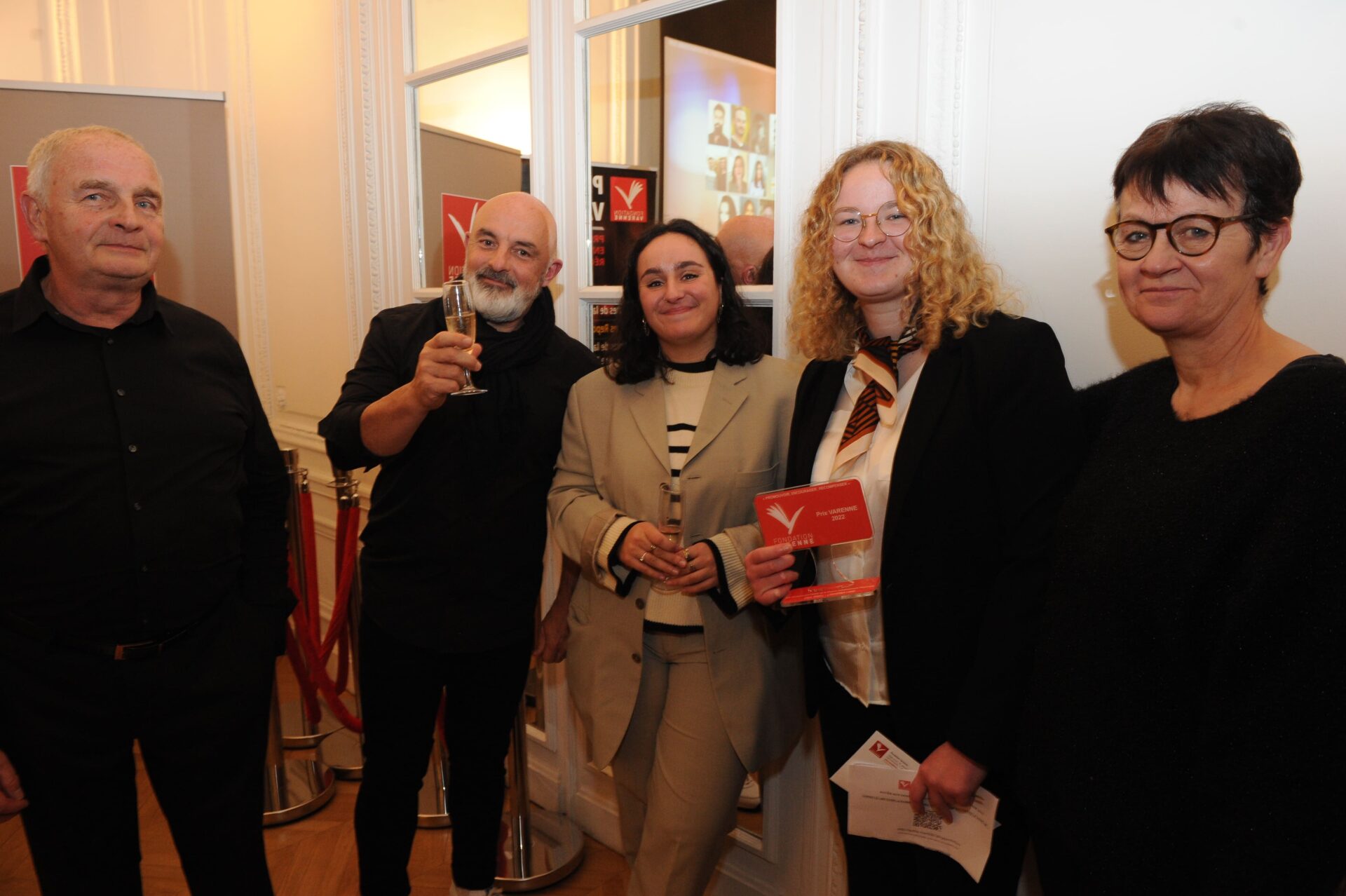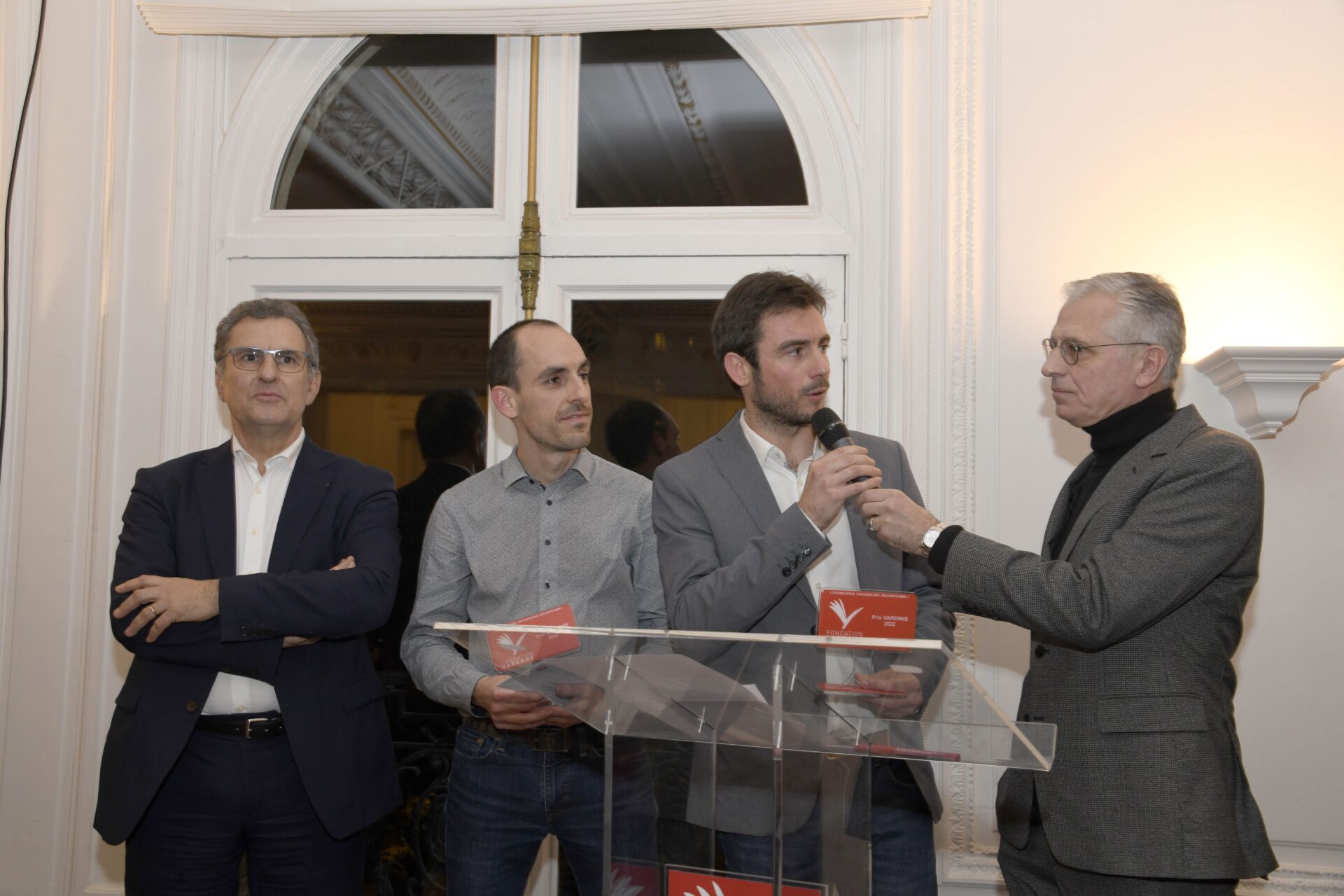 Rachida El Azzouzi et Mortaza Behboudi Médiapart Grand Prix PQN exaequo entourés de Jean-Yves Vif président du jury PQN et Philippe Carli