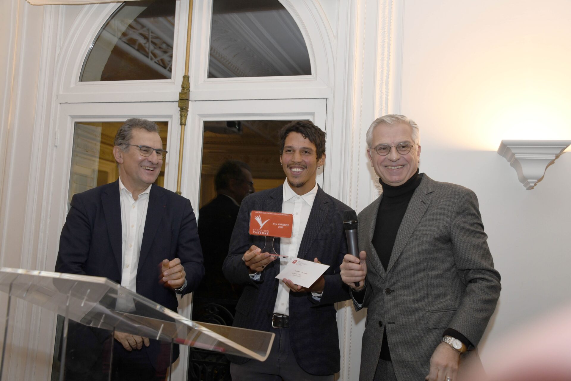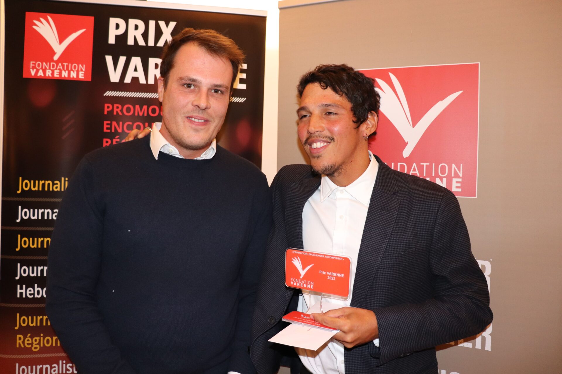 Juan Palencia BFMTV Prix jeune journaliste JRI entourés de Philippe Carli et Thierry Cabannes (de g à d)