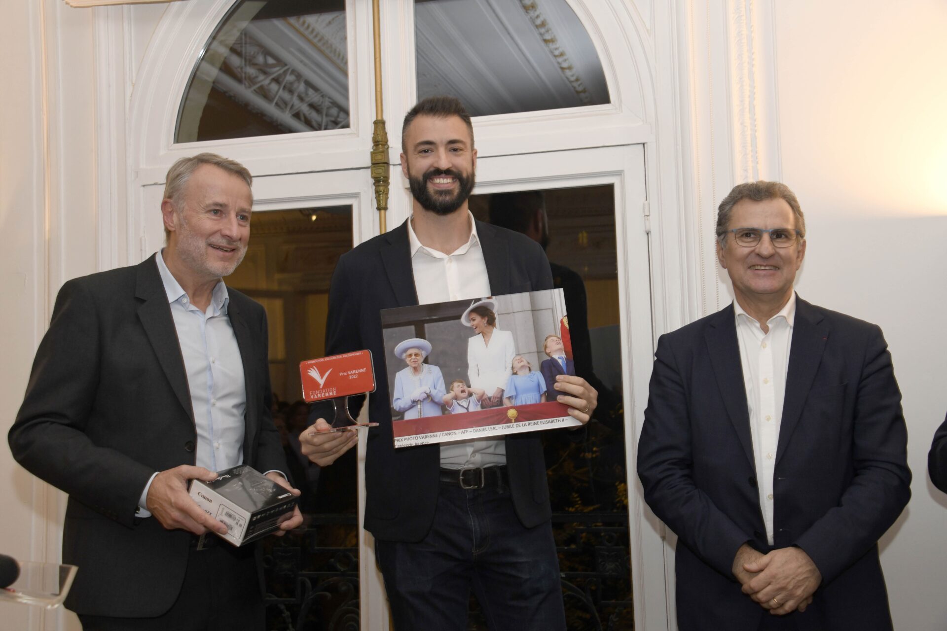 Laurent Dard La Dépêhe du Midi Prix Photo PQR entre Roch Lorente Canon partenaire du prix et Philippe Carli