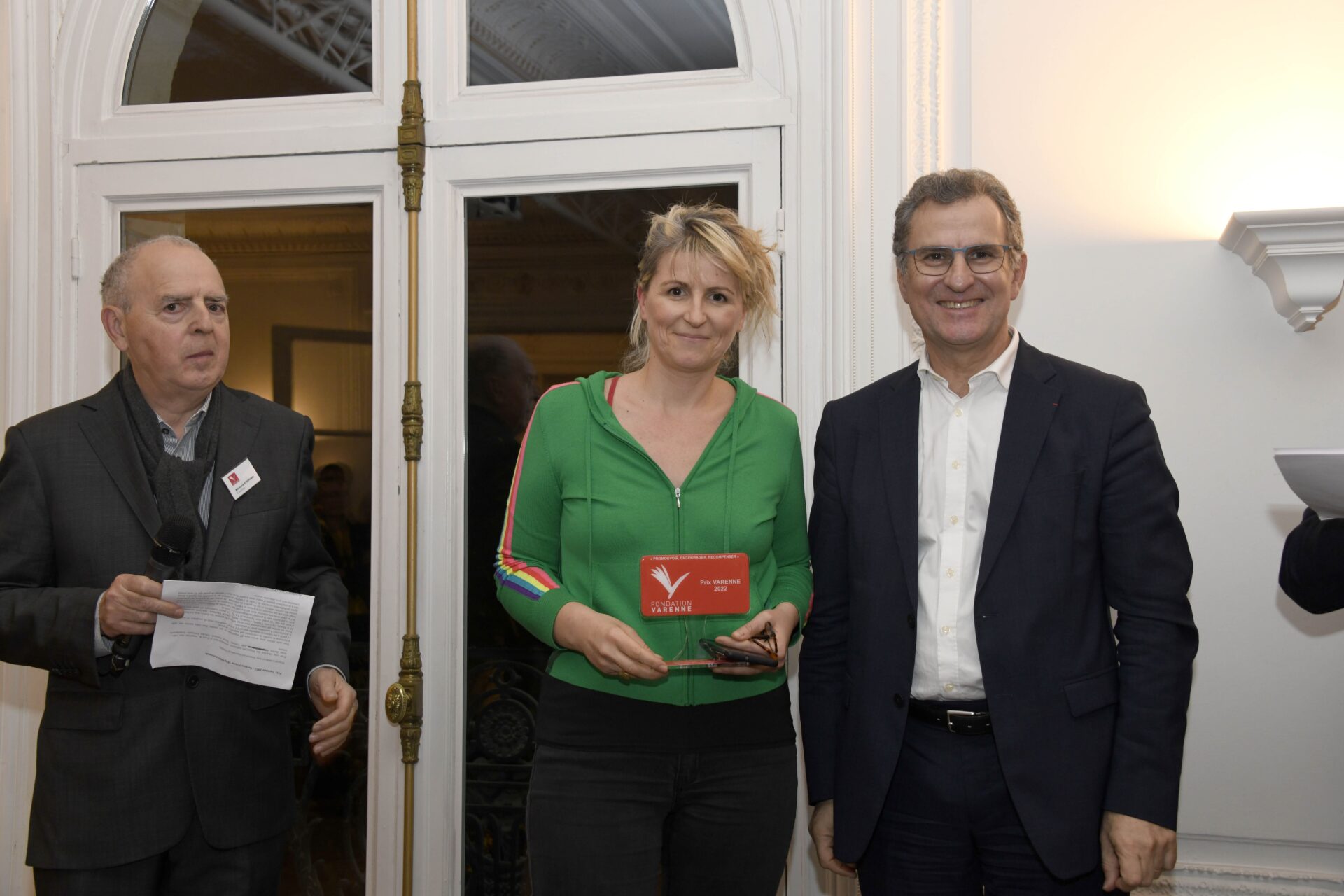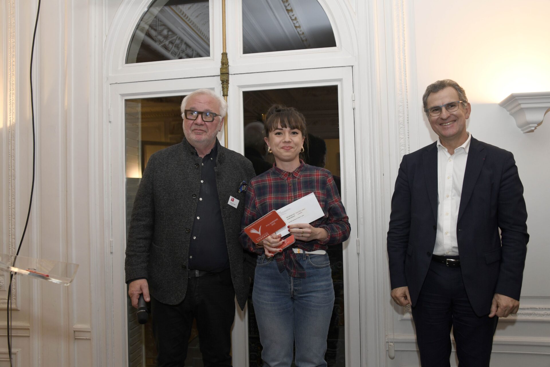 Margaux Queffelec France Info Prix jeune journaliste radio entourée de Catherine Mangin présidente du jury Radio et Philippe Carli