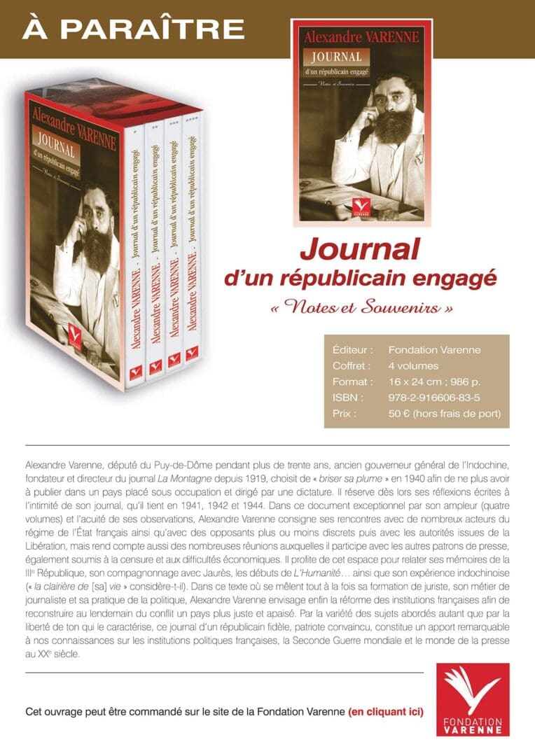 Nous souhaitons que ce Journal d’un républicain engagé apparaisse comme l’hommage mais aussi comme l’illustration de sa mission, de la Fondation Varenne à la mémoire de celui dont elle porte le nom, qui a eu la joie de « voir reverdir l’arbre de la Liberté » comme il l’espérait un jour sombre de septembre 1941, en plein cœur de la tourmente mondiale pendant laquelle le juriste rigoureux, le journaliste talentueux et le républicain passionné qu’il était a su comprendre le réel sans perdre l’espoir d’aller à l’idéal, pour reprendre une formule fameuse du Discours à la jeunesse de Jaurès, le seul maître qu’il se reconnaisse.